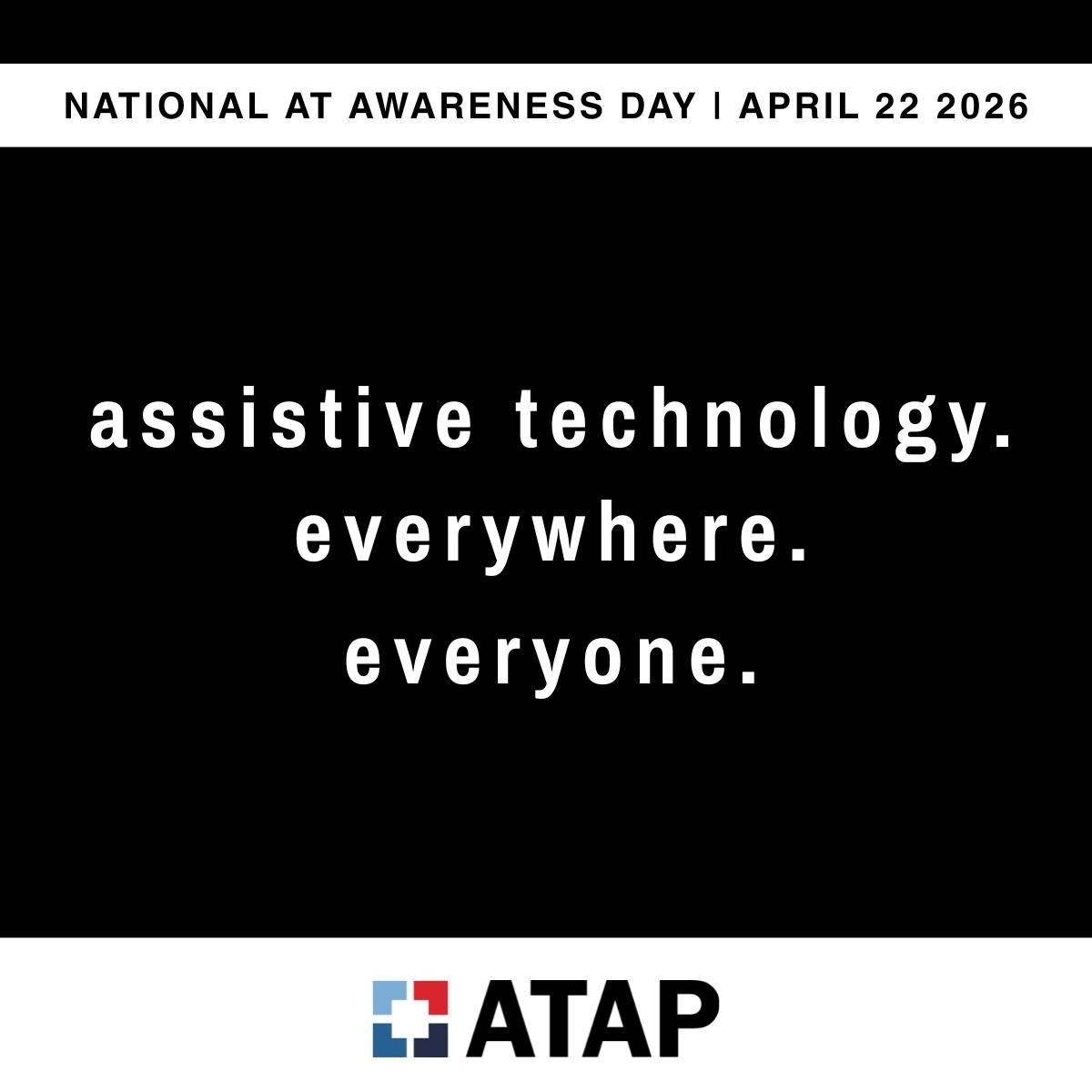 National AT Awareness Day is April 22, 2026 The words assistive technology. everywhere. everyone one on a black background with the ATAP logo under it